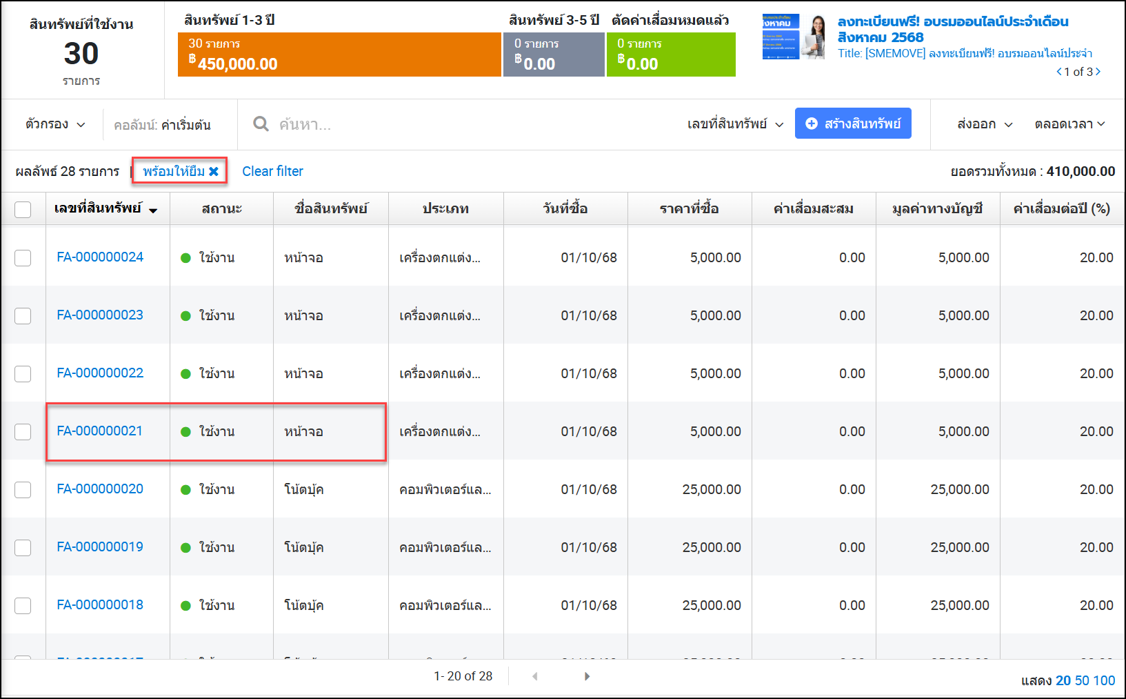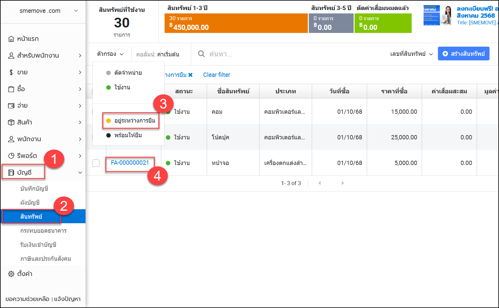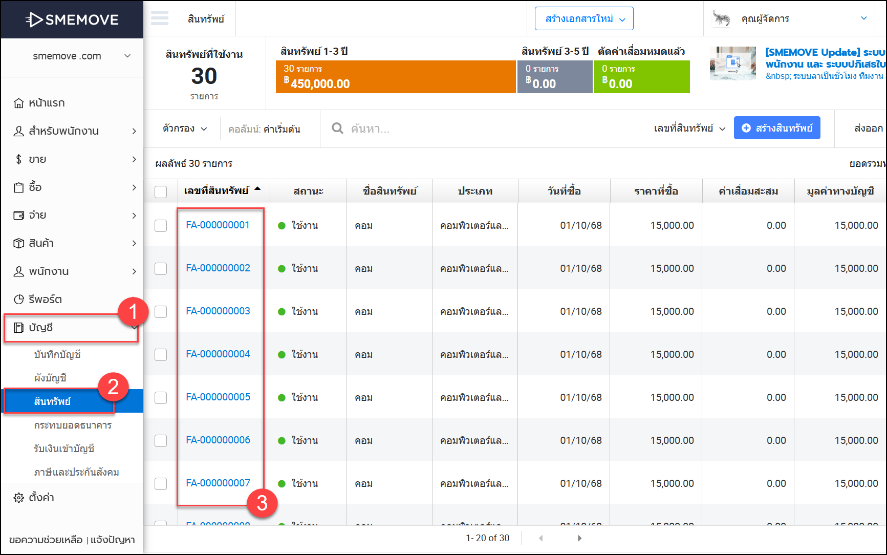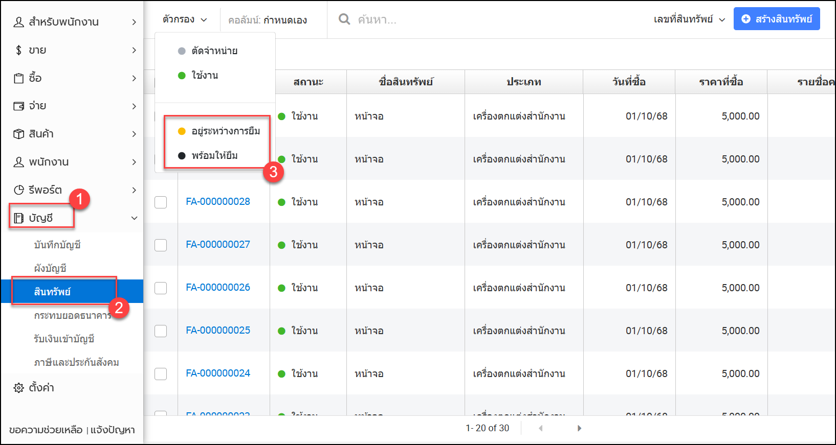 - เมนูบัญชี > สินทรัพย์ > เลือกสินทรัพย์ที่ต้องการ