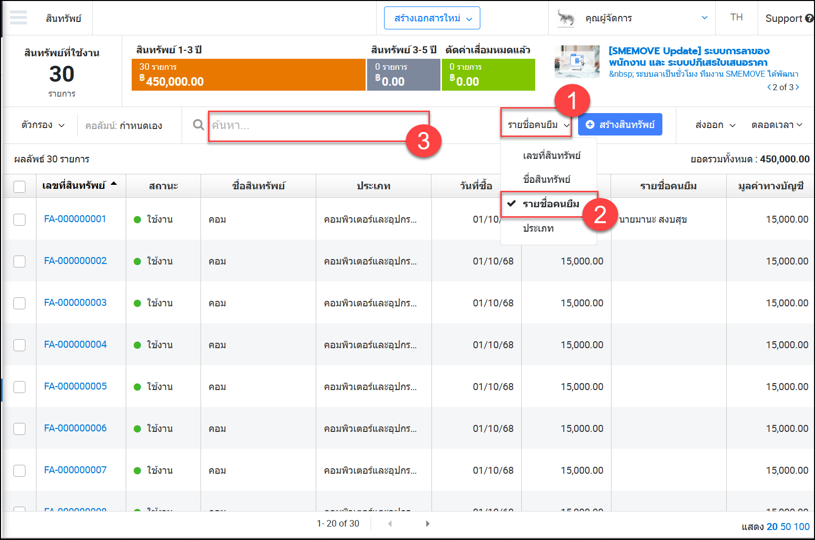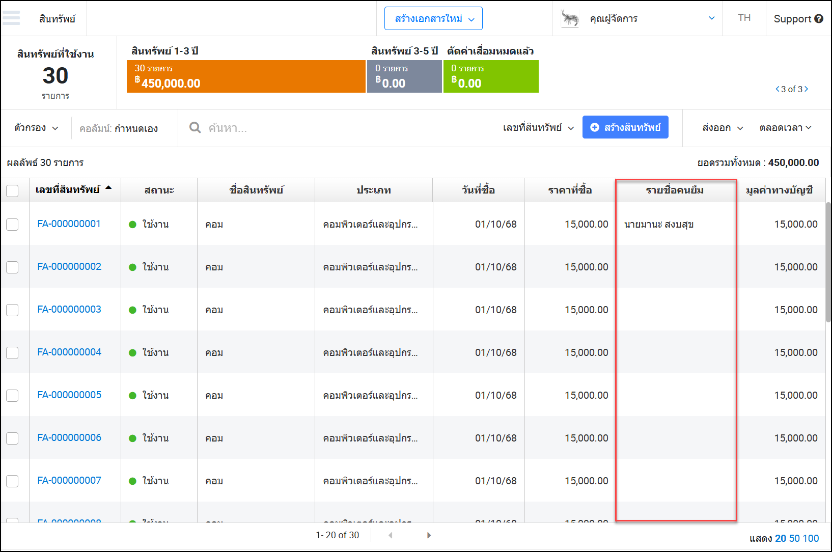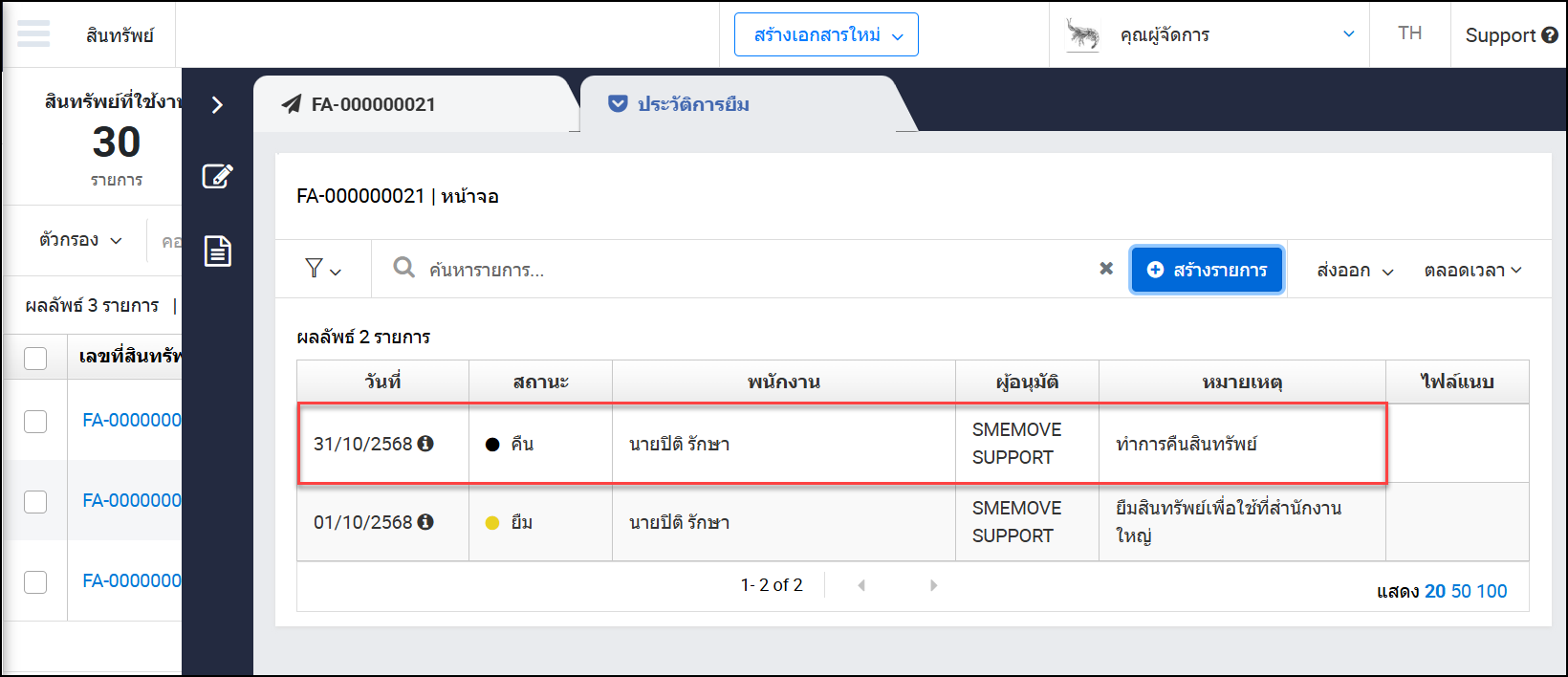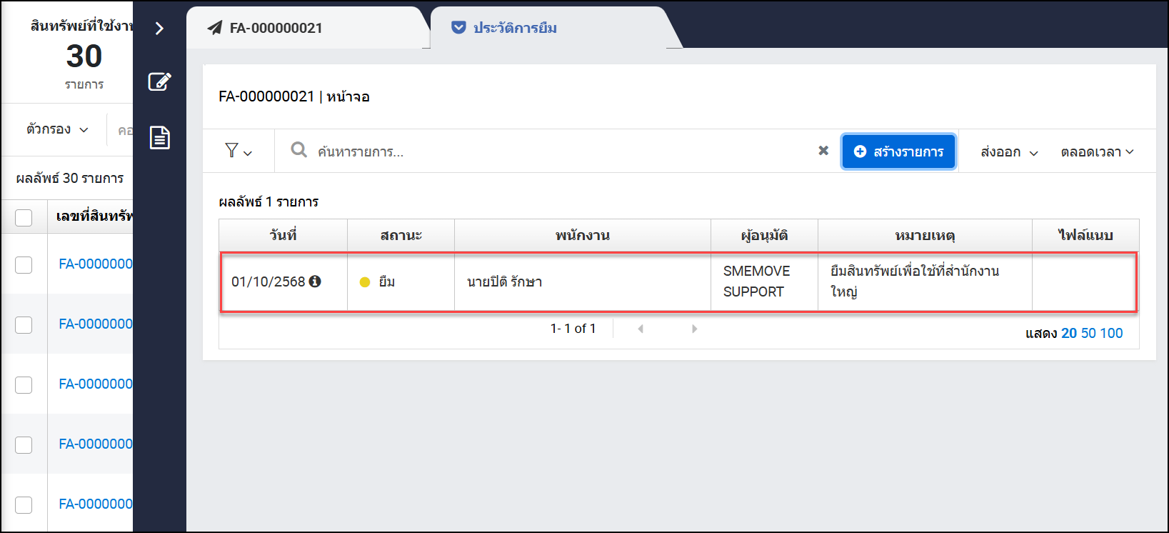 - จะแสดงคอลัมน์ “รายชื่อคนยืม” และแสดงชื่อพนักงานที่ยืมสินทรัพย์