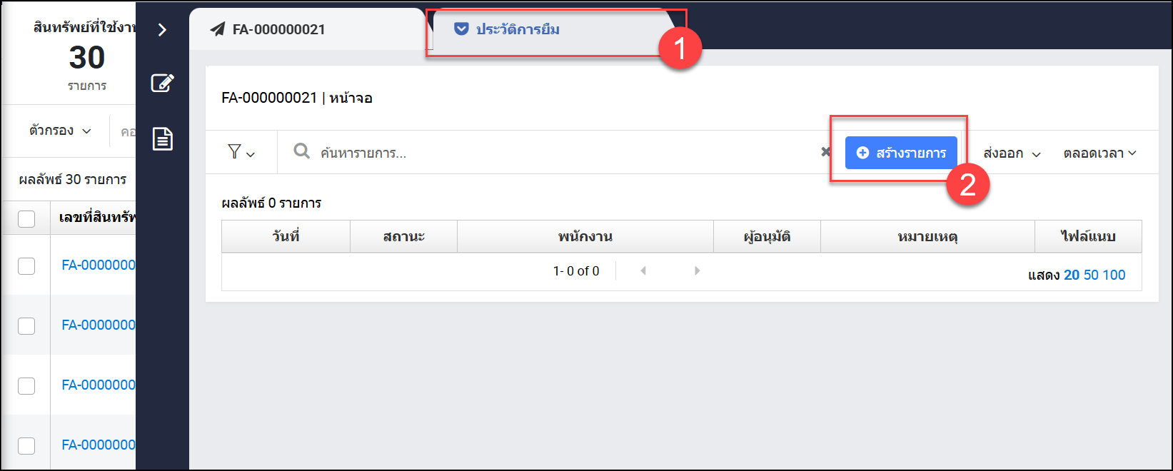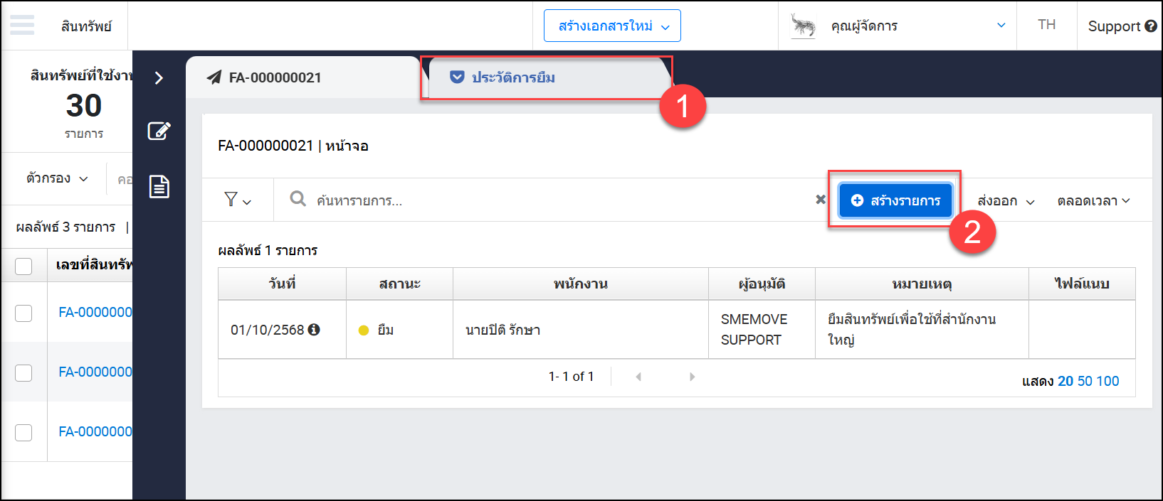 เมื่อกิจการทำการเพิ่มสินทรัพย์เข้าสู่ระบบแล้ว และต้องการให้พนักงานยืมสินทรัพย์เพื่อใช้งาน สามารถทำรายการยืม – คืนสินทรัพย์ได้ตามขั้นตอนดังนี้