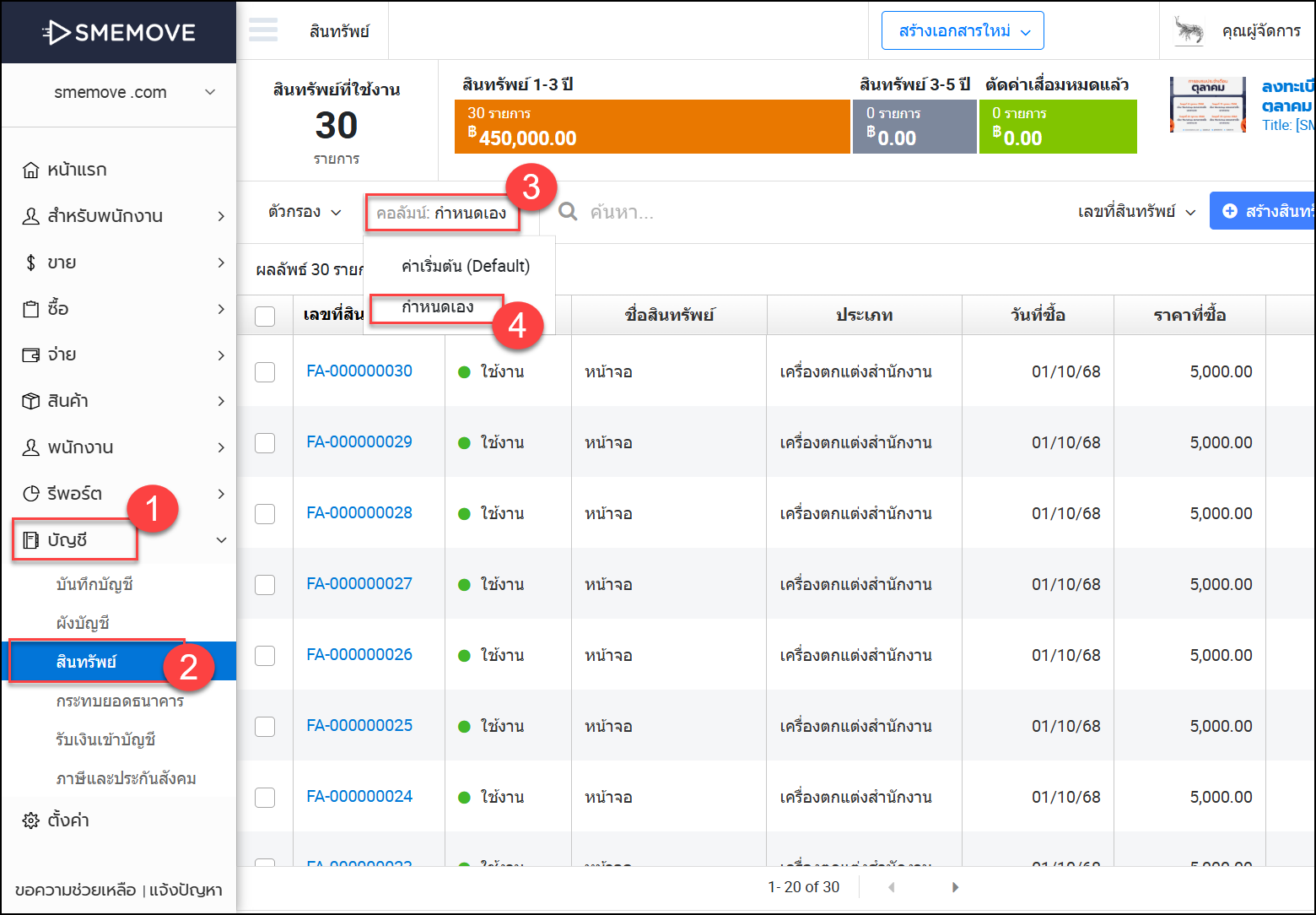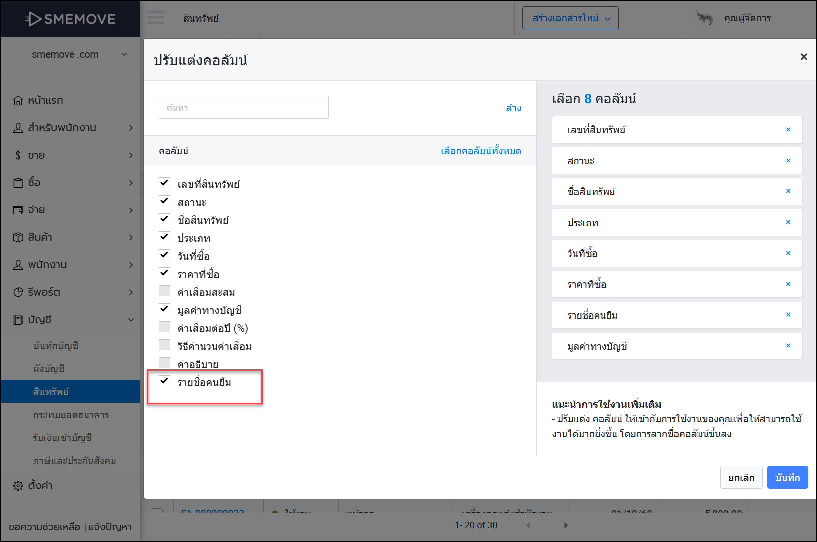 - เมนูบัญชี > สินทรัพย์ > คอลัมน์ > กำหนดเอง