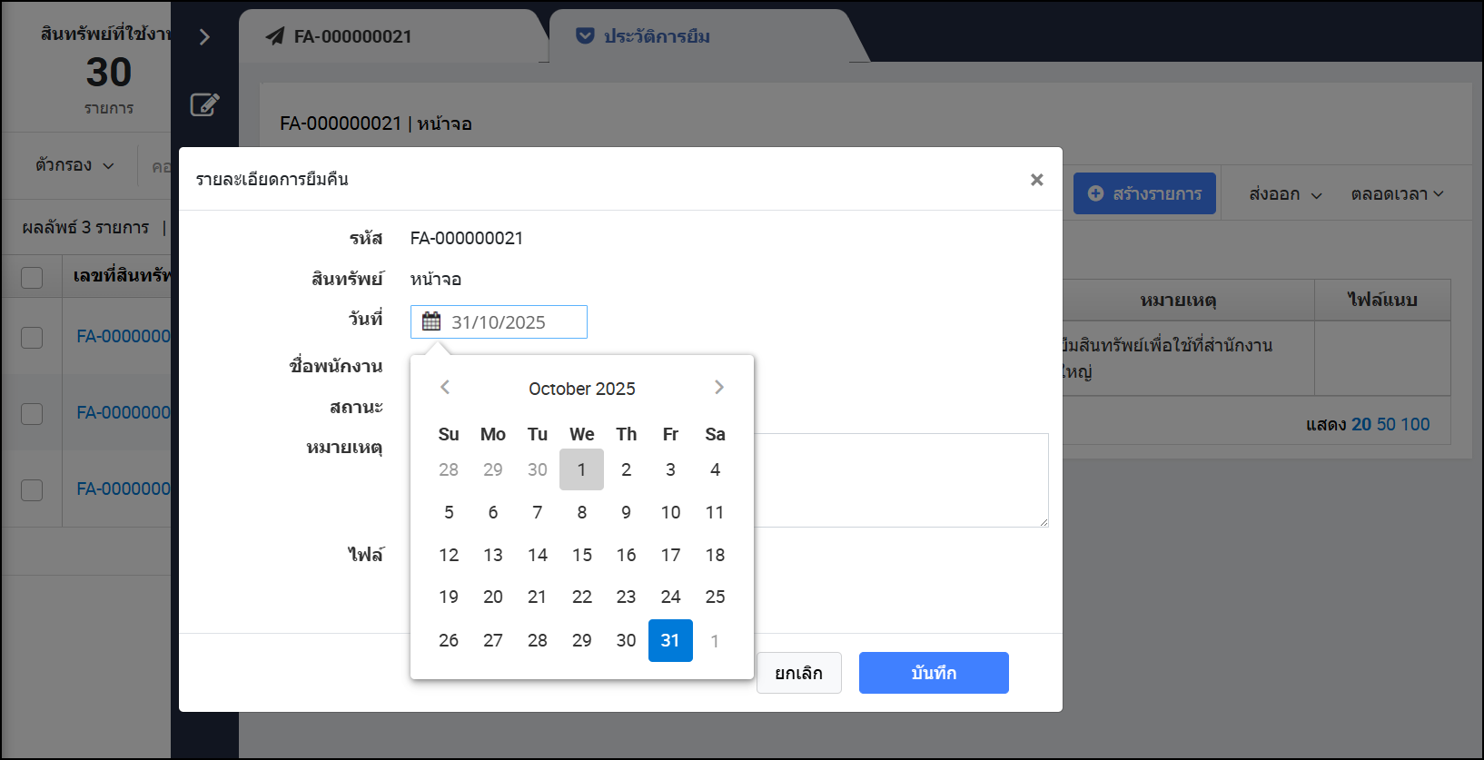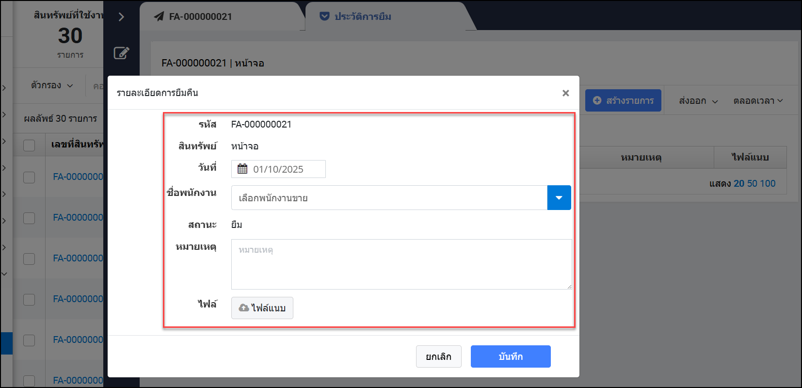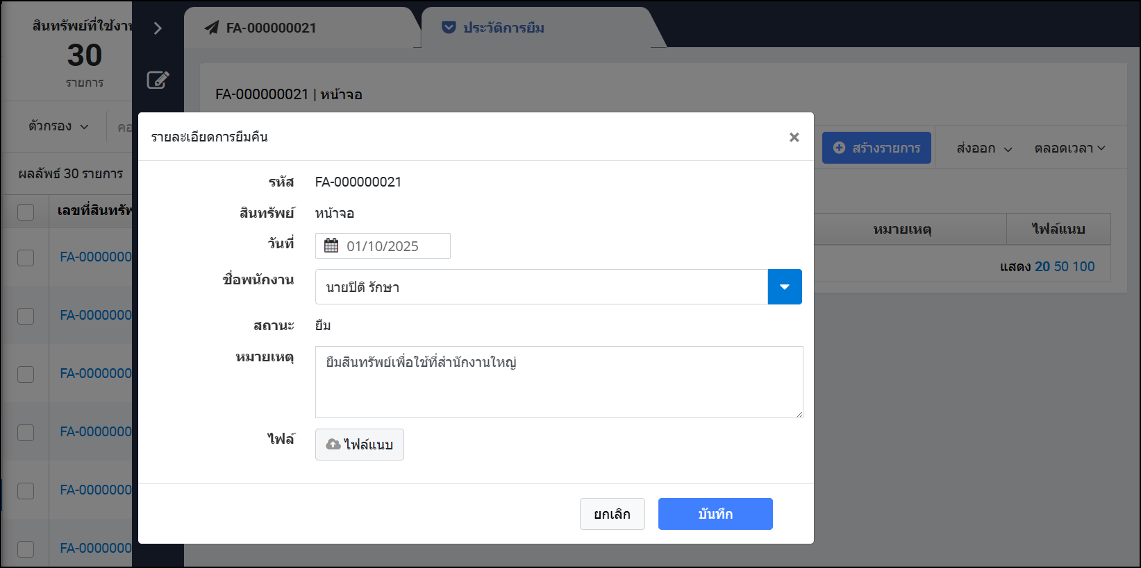 - เลือกวันที่ยืม > เลือกชื่อพนักงานที่ยืม > ใส่หมายเหตุและไฟล์รูปภาพที่เกี่ยวข้อง > กดบันทึก